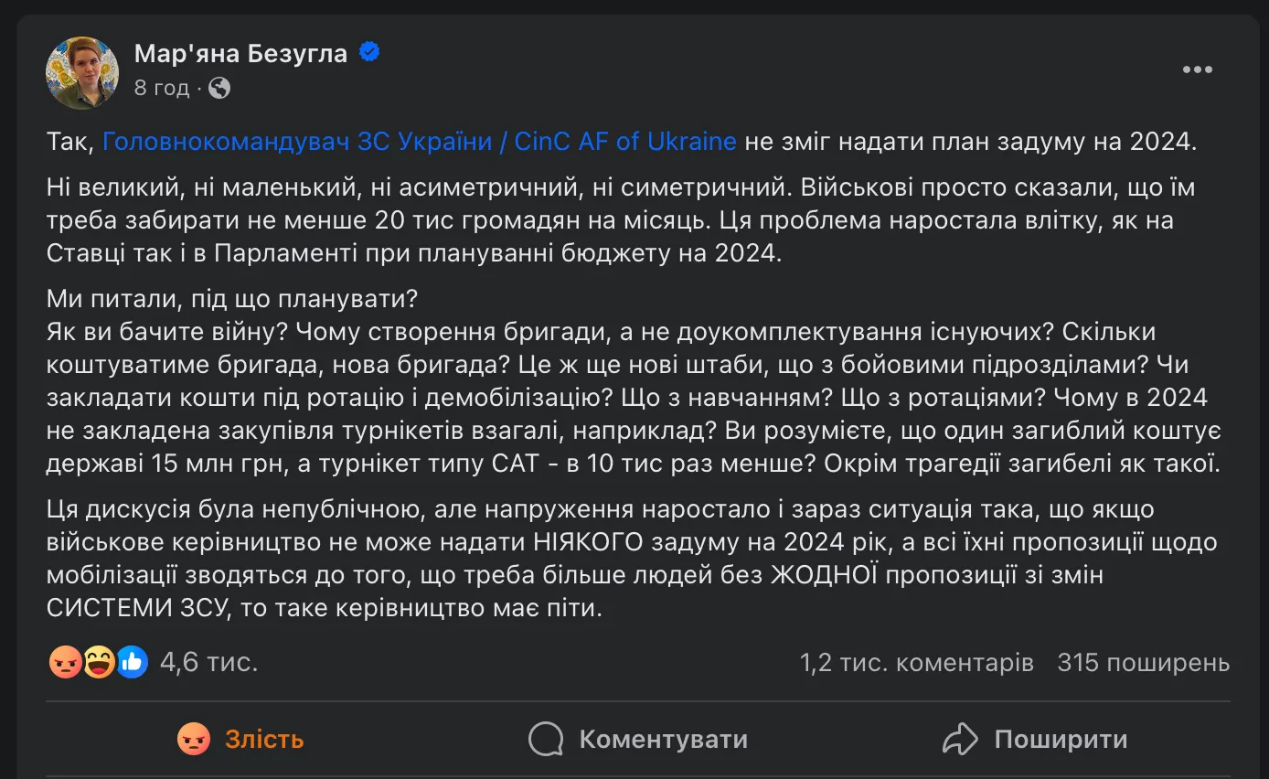 26 ноября Марьяна Безуглая написала в своем фейсбуке пост, который взбудоражил общественность. В нем обвинила Залужного в том, что не показал "план" на 2024 год, а также призвала военное руководство уйти. А уже 27 ноября в Верховной Раде зарегистрировали проект постановления об отзыве ее с должности заместителя главы Комитета по национальной безопасности, обороне и разведке.