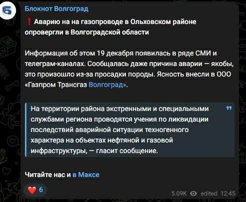 Россияне заявили о повреждении многокилометрового советского газопровода. По версии местных властей Волгоградской области труба, которая годами транспортировала газ из Туркменистана, Узбекистана и Казахстана, в один момент просто не выдержала силы земного притяжения. Якобы "проседание грунта" произошло возле Романовки Ольховского района. По крайней мере так написали россияне в своих СМИ.