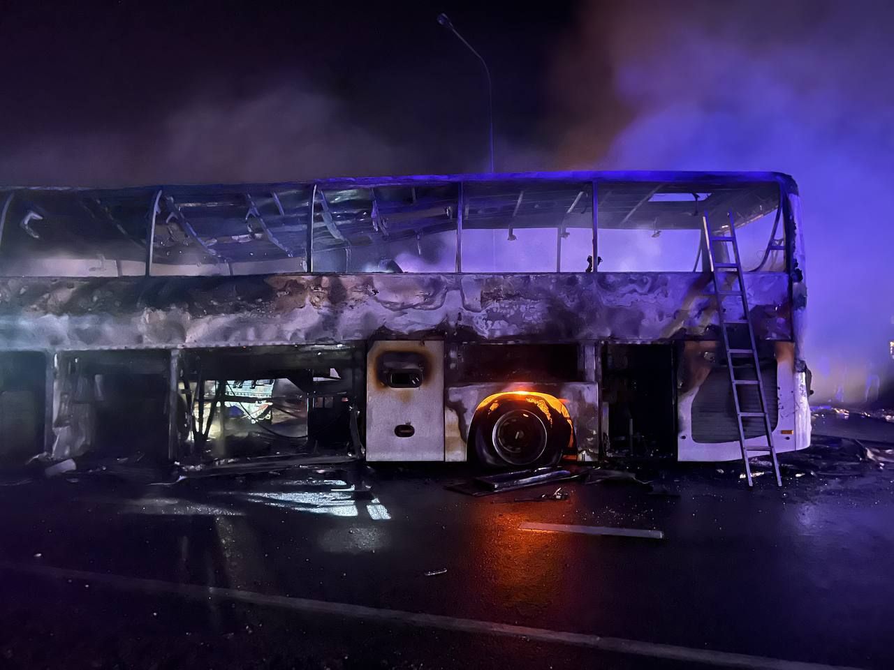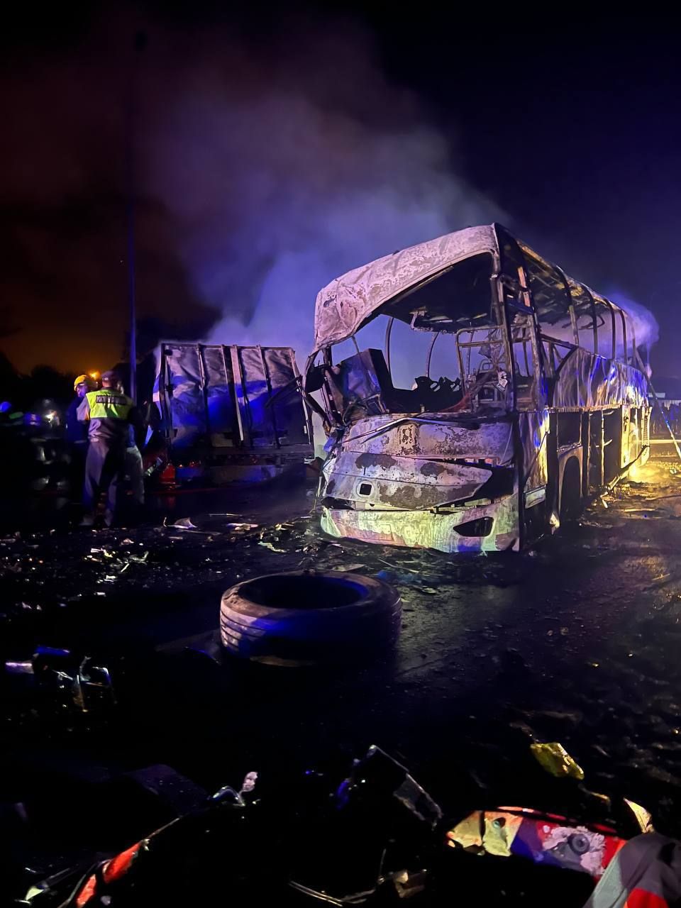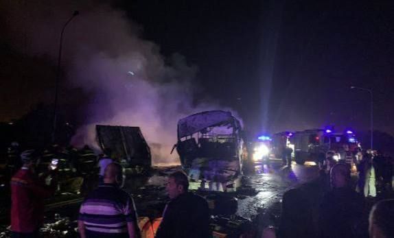 В результате столкновения автобуса и грузовика вспыхнул огромный пожар: смотрите видео
