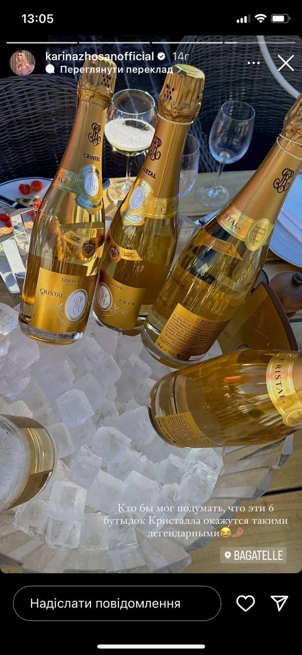 Цена такого отдыха за 2–3 часа составляет около 50 тысяч долларов. Стоимость одной бутылки шампанского Crystal, которую весело попивала компания, в Украине составляет около 13–16 тысяч гривен.