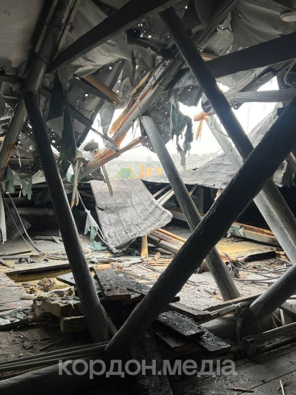 Руководитель Офиса Президента Андрей Ермак уточнил, что удар был нанесен по Перинатальному центру. Там загорелась крыша. В результате удара было повреждено перекрытие, а обломки посекли кровлю.