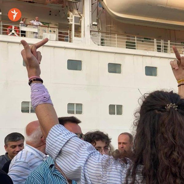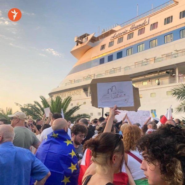 Корабль с сотнями россиян прибыл в страну из Сочи 26 июля. В знак протеста жители Батуми собрались возле него на следующий день вечером.
