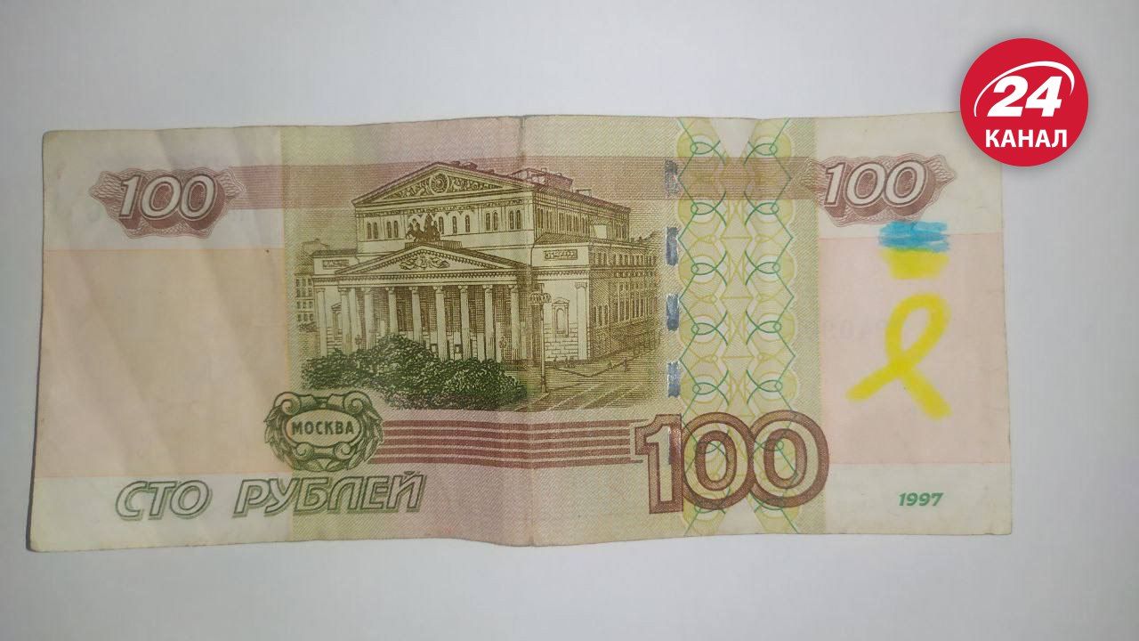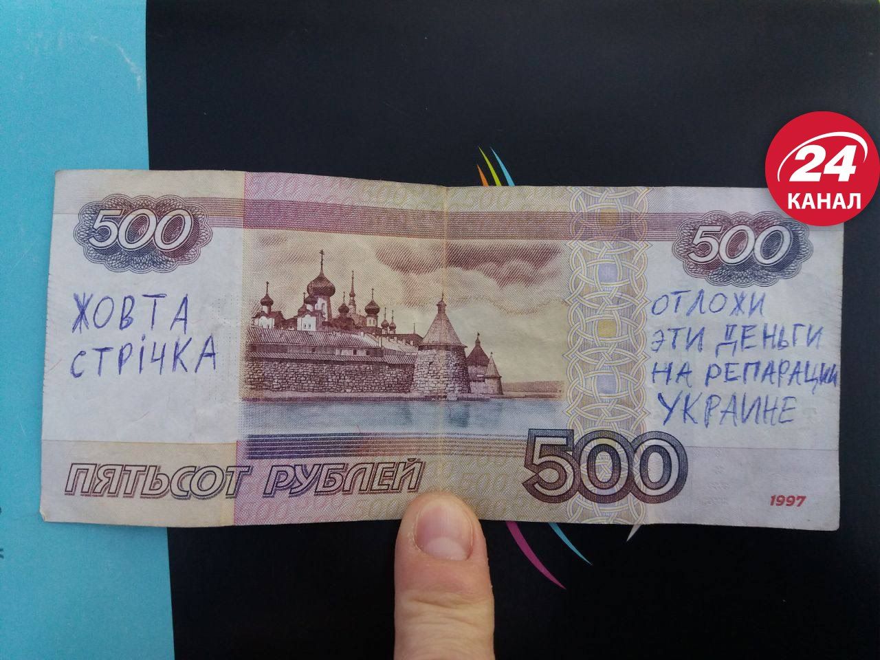 На банкнотах рисуют символику движения сопротивления "Желтая лента", призывают россиян возвращаться домой и напоминают, что Украина обязательно вернет себе границы 1991 года. На одной бумажке, номиналом 500 рублей, даже написали, чтобы оккупанты сохранили эти деньги на репарации Украине.