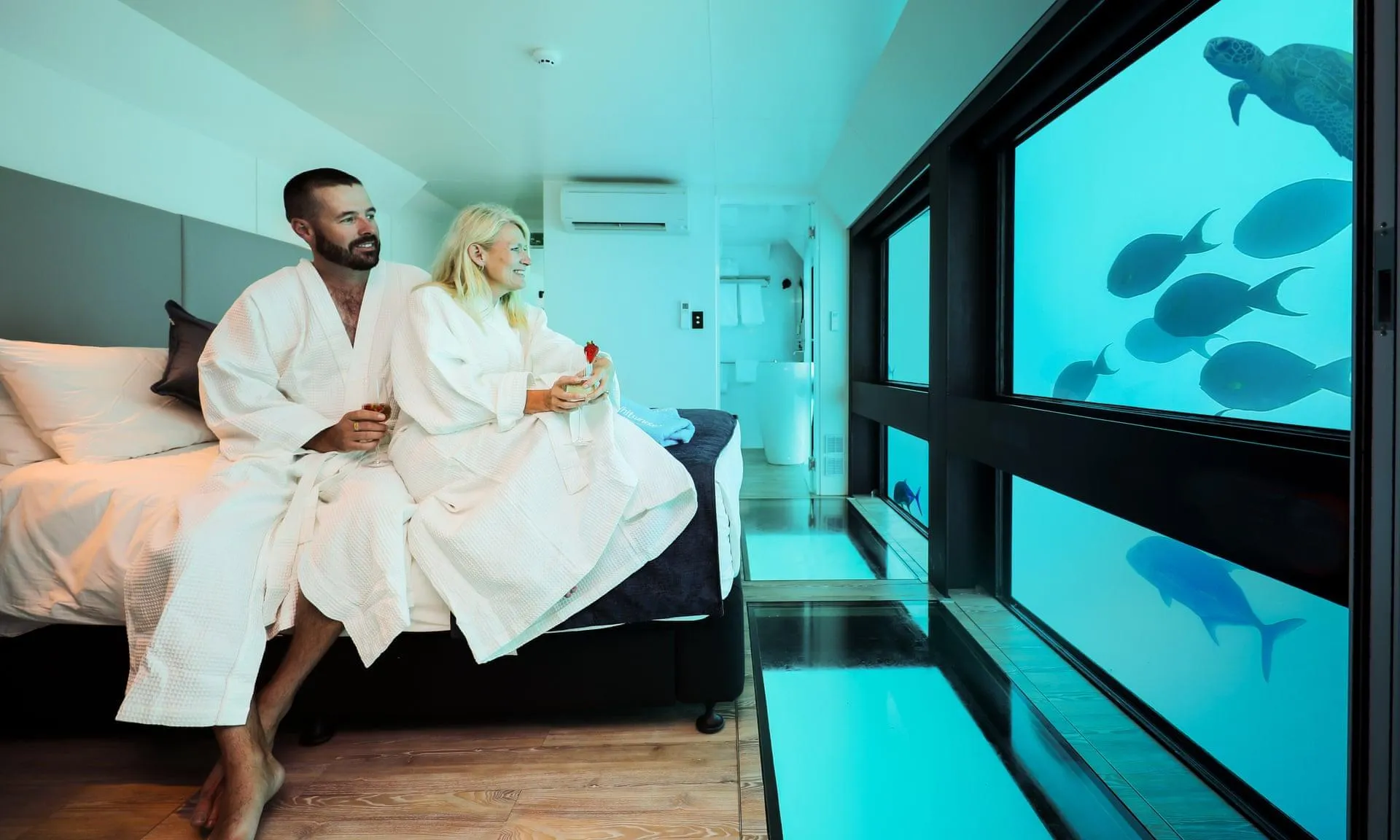Одна стена в номере полностью из стекла. Сквозь нее можно наблюдать за уникальной экосистемой Большого барьерного рифа.
