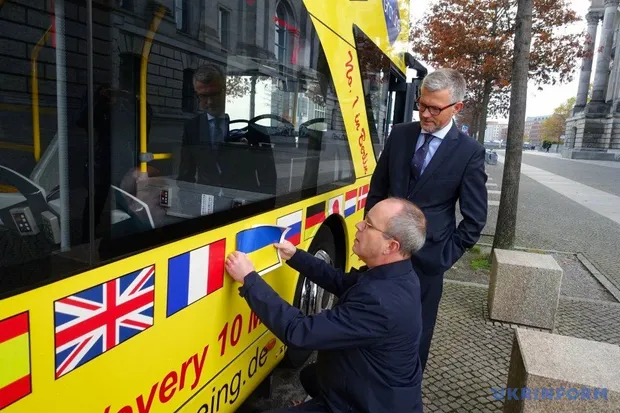 Посол Украины в Германии Андрей Мельник и руководитель туристического предприятия Михаэль Грефе торжественно наклеили украинский флажок на первый такой автобус.