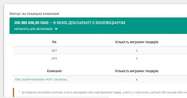 Стоит отметить, что не все декларации содержат подраздел “выручка на тендерах”, а только те, в которых указаны компании-победители тендеров. Если информация отсутствует, это означает, что связанные с декларантом компании не выигрывали тендерных закупок в Украине.
