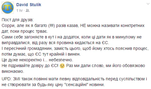 Как я много раз говорил, нельзя называть конктретного дат, пока процесс продолжается. Сами себя загоняете в угол и в дополнение, когда эти даты как в прошлом не оправдались, сразу вся вина падает на ЕС,