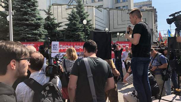 Митингующие принесли плакаты "Назад в СССР", "Маленький мальчик нашел молоток и возвратил Украину в совок" и "Судья! А ты сохранил свой партбилет?!".