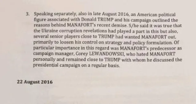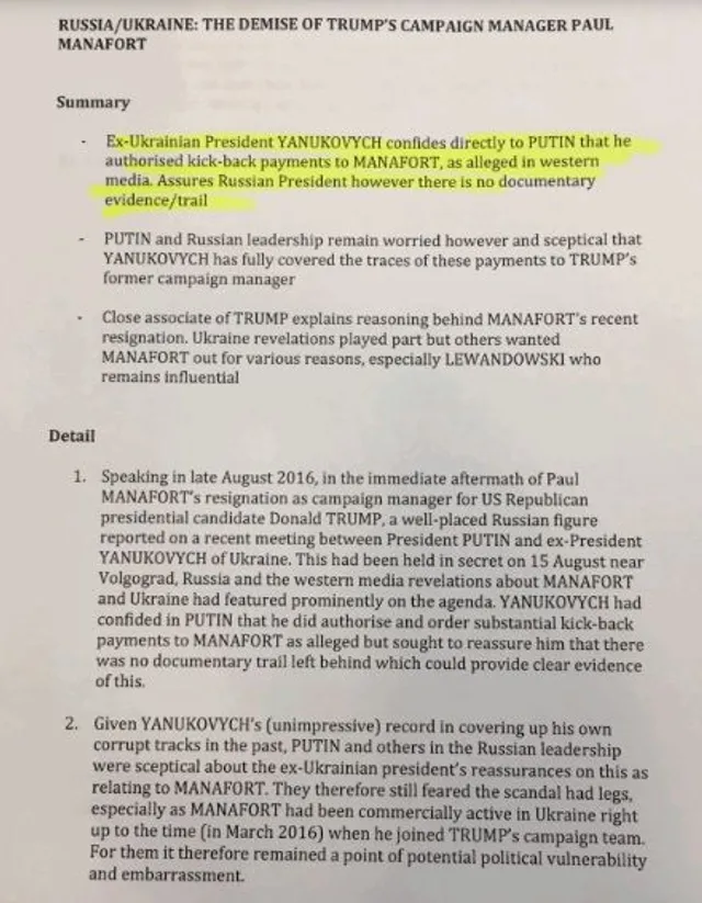 В документе есть раздел, посвященный связям бывшего главы избирательной кампании Трампа Пола Манафорта с коррупционными схемами экс-президента Украины Виктора Януковича.