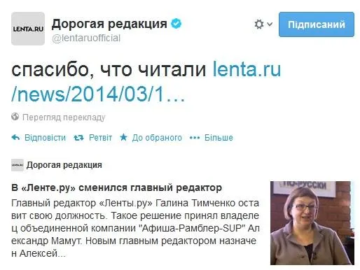 Тем временем в Twitter-ленте работники издания пишут "Спасибо, что читали" и добавляют ссылку на новое назначение.