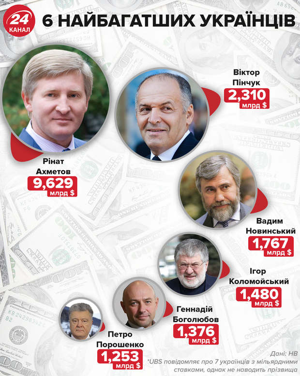 По данным исследования журнала НВ совместно с инвесткомпанией Dragon Capital украинскими миллиардерами являются Ринат Ахметов, Виктор Пинчук, Вадим Новинский, Игорь Коломойский, Геннадий Боголюбов и Петр Порошенко.