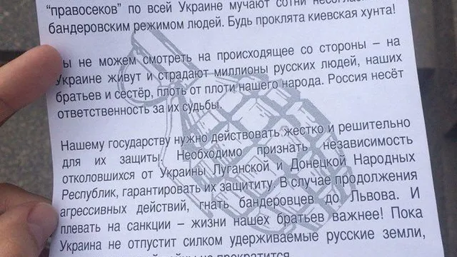 "Нашему государству нужно действовать жестко и решительно. Необходимо признать независимость отколовшихся от Украины "ДНР" и "ЛНР", гарантировать их защиту. В случае продолжения агрессивных действий — гнать бандеровцев до Львова. И плевать на санкции — жизнь наших братьев важнее!" — говорится в листовке.