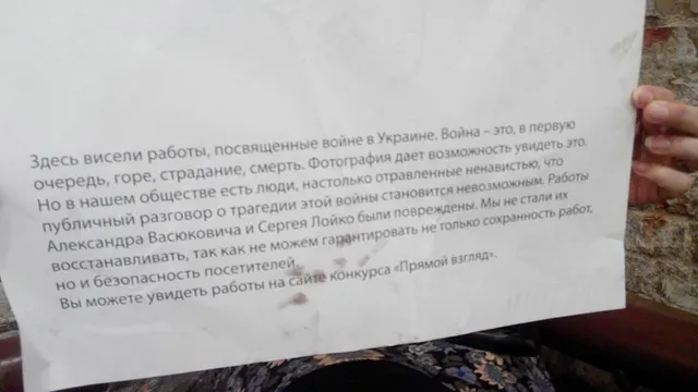 Напомним, что выставку пытались сорвать дважды. Сначала фотографии испортили краской из баллончика.