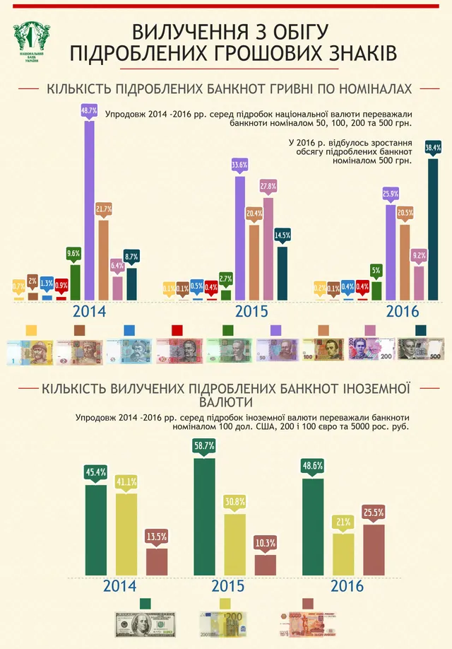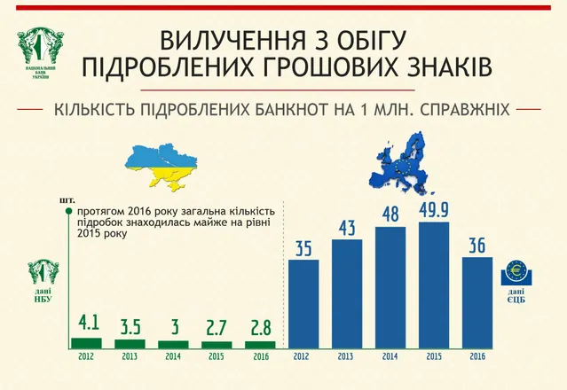 Так в 2016 году на миллион настоящих банкнот гривны приходилось около 2,8 единицы поддельных банкнот.