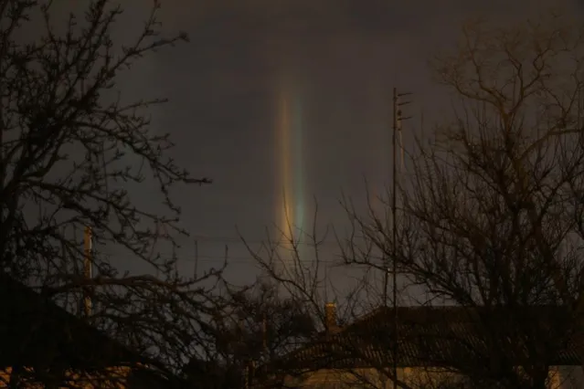 По разным версиям, на фотографиях сняты преломления городского света ледяными кристаллами или смещенное на юг северное сияние.