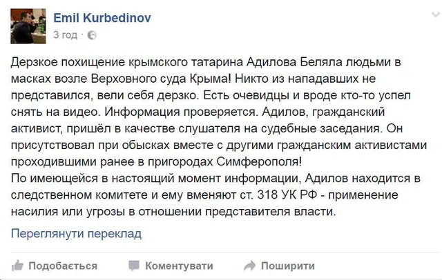 "Адилов, гражданский активист, пришел в качестве слушателя на судебные заседания. Он присутствовал при обысках вместе с другими гражданскими активистами, которые проходили в пригородах Симферополя!" – написал адвокат.