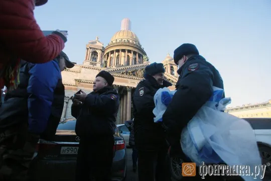 Инициаторами мероприятия стали участники общественного движения "Весна". Сами организаторы планировали вывесить надпись: "Слава богу, не РПЦ", однако контроль полиции им помешал полностью реализовать задуманное.