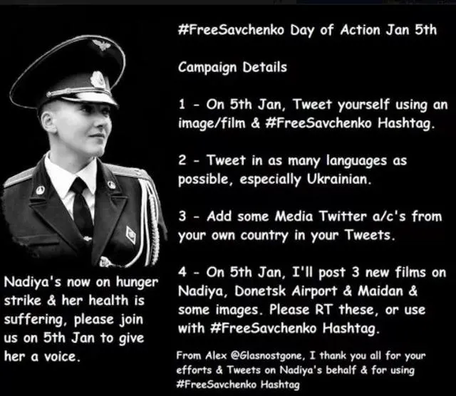 Инициаторы призывают распространять информацию о летчице, а также фото- и видеоматериалы на разных языках с хештегом #FreeSavchenko по следующему алгоритму: