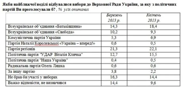 Если сравнивать эти цифры с данными марта, то увеличилось количество избирателей, которые намерены проголосовать за "Батькивщину", "УДАР" и за КПУ.