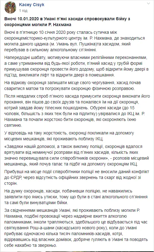 В ночь на субботу, 11 января, нетрезвый хасид начал просить охранника, чтобы тот провел его к месту, где тот живет, чтобы открыть ему дверь. Мотивировал он это тем, что не может сам этого сделать из-за шабата, рассказал в фейсбуке пользователь с именем "Кейси Цисык". Сообщение массово распространяют в местных пабликах.