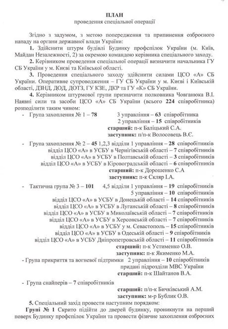Тогда Москаль опубликовал "План проведения специальной операции", где в пункте 4 определено, что в группу прикрытия и огневой поддержки и группу снайперов, среди прочих, входила группа 2-го управления спецподразделения "Альфа", возглавляемая Шайтановым. В его группу также были прикомандированы еще 10 сотрудников подразделений МВД Украины.