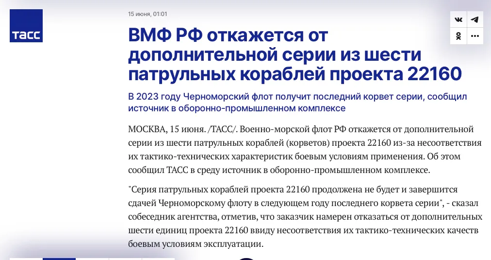 22160 – это тот же корвет "Василий Быков", на который россияне недавно поставили на палубу зенитно-ракетный комплекс ТОР-М2КМ (дополнительные 30+ тонн на палубу). После потери "Москвы" оказалось, что российское ПВО в Черном море очень слабое.