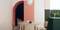 Именно так возникла идея совместить глубокий синий с нежным коралловым в прихожей с нишей при входе. Эти же цвета перекликаются в противоположной части квартиры, где в них выполненно небольшое рабочее пространство и отделена шкаф.