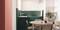 Для кухни свободной планировки дизайнеры выбрали свежий оттенок зеленого для плитки и мебельной фурнитуры, соединив его со светлой мебелью в столовой рядом.