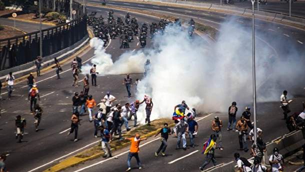 В Сети появились многочисленные видео того, как венесуэльские военные разгоняют протестующих, стреляя в воздух.