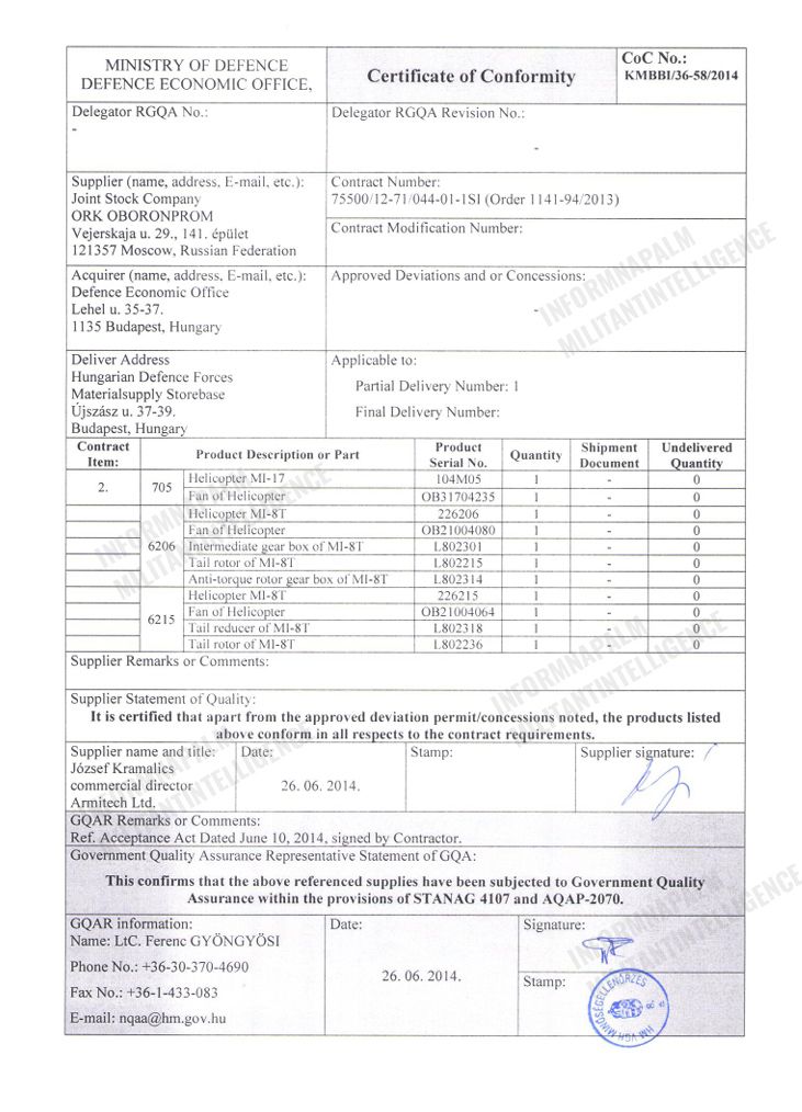Еще один документ подтверждает поставки компонентов к вертолетам Ми-17/Ми-8 венгерским ВВС от российской компании "Оборонпром". Отгрузка проводилась через Минобороны Венгрии в обход санкций ЕС, наложенных после российской оккупации Крыма.