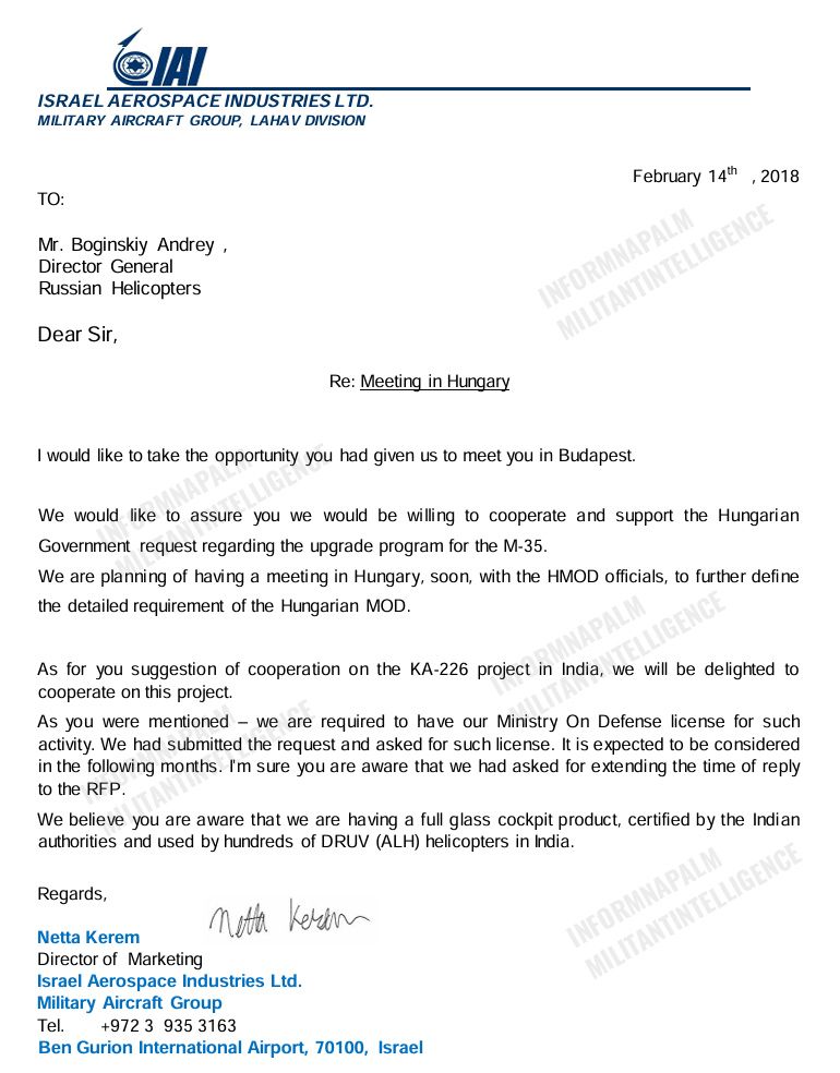 Кроме того, расследователи располагают письмом, адресованным генеральному директору "Вертолетов России" Андрею Богинскому, где израильская компания IAI выражает готовность к участию в модернизации вертолетов Ми-35 для Венгрии и сотрудничества с Россией по проекту Ка-226 в Индии.
