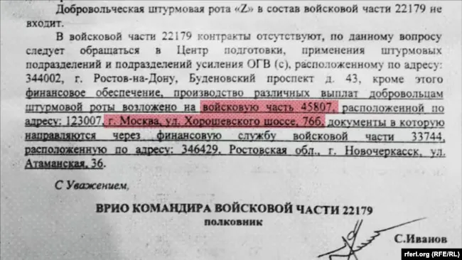 Финансовое обеспечение, осуществление различных выплат добровольцам штурмовой роты возложено на московскую воинскую часть 45 807,