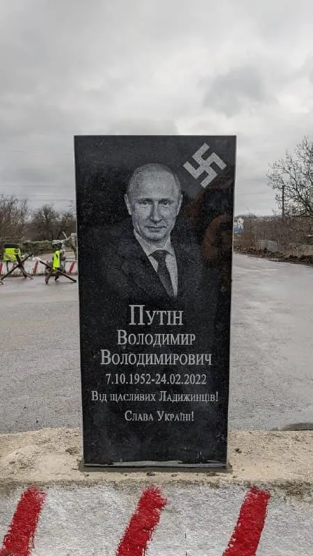 На въезде в город Ладыжин в Винницкой области создали надгробие с изображением Путина. На надгробии указали дату смерти – 24 февраля. Именно в этот день Россия атаковала территорию Украины по разным направлениям.