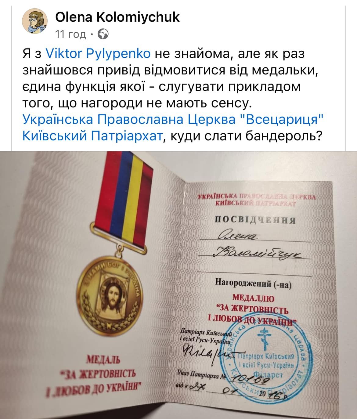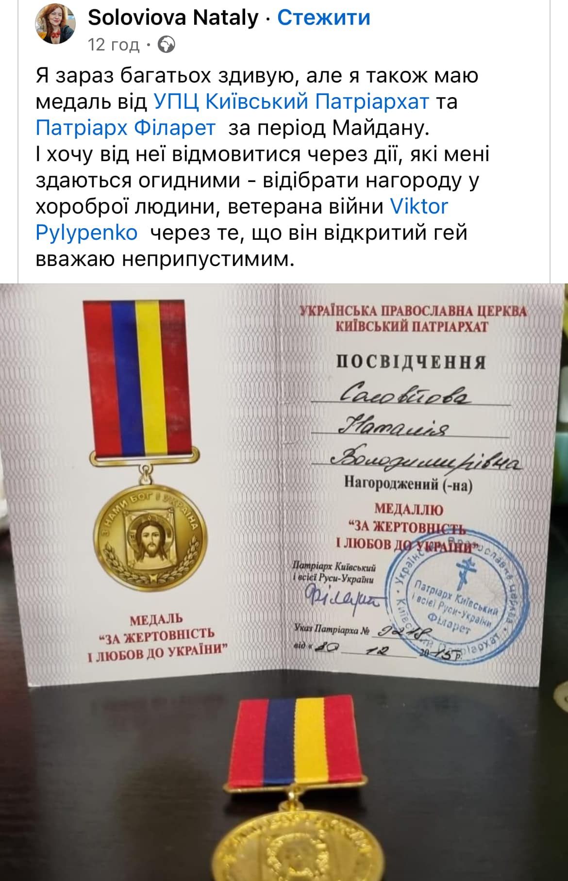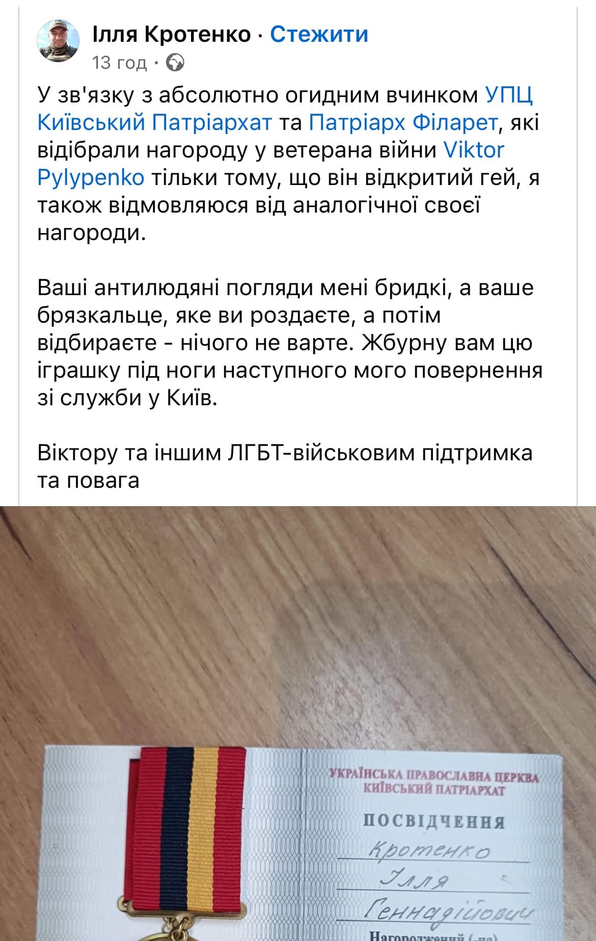 Виктор Пилипенко после получения награды от Патриарха поделился в соцсетях фото медали и отметил, что это якобы означает изменение УПЦ КП своей позиции в отношении ЛГБТ-сообщества.