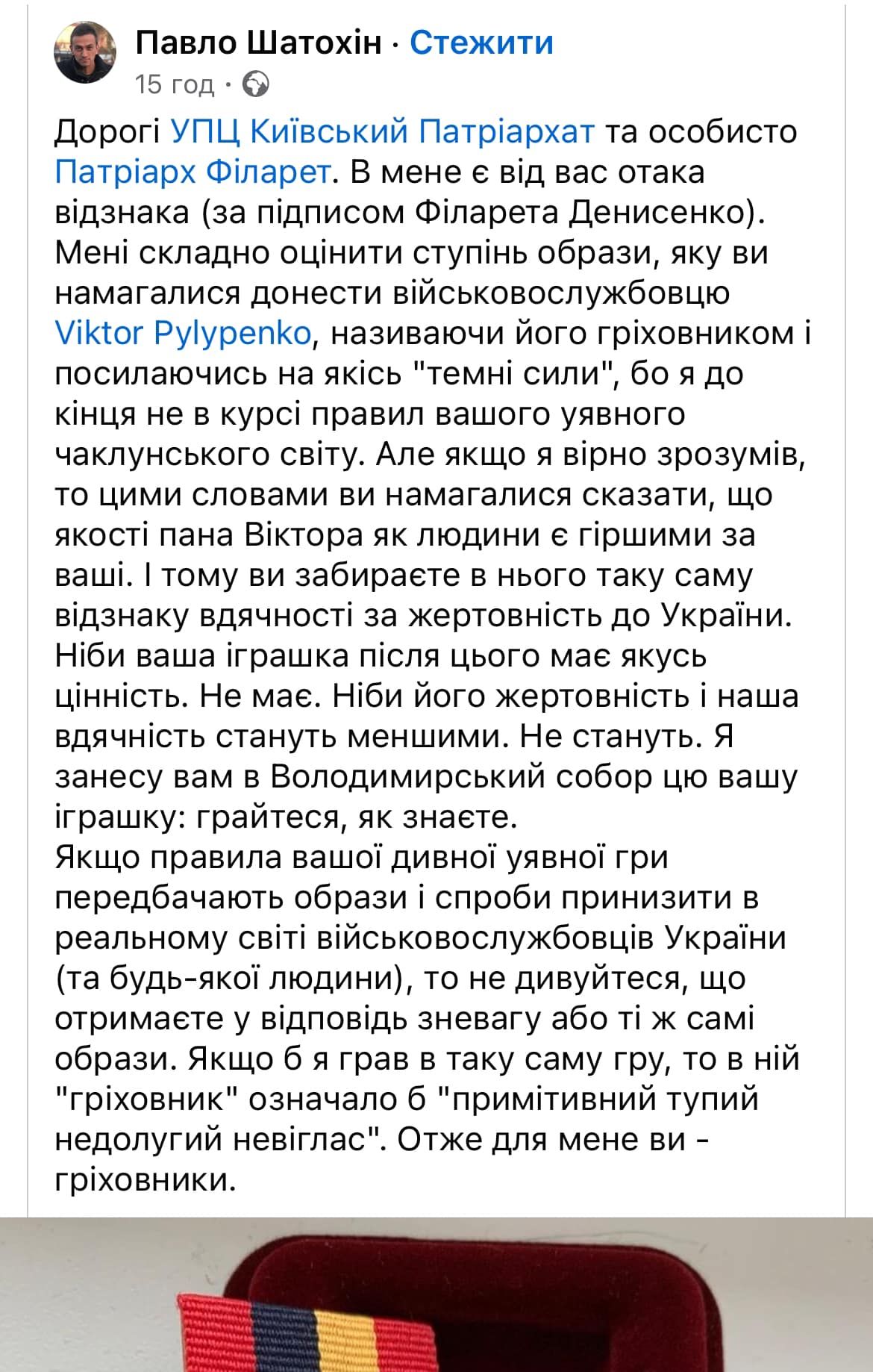 Мы благодарим воина Виктора Пилипенко за его военные заслуги, но не разделяем его греховных предпочтений и агитацию ЛГБТ. Сообщаем, что ввиду открытой пропаганды греховной идеологии и отрицания существования Бога, считать церковную награду Виктору Пилипенко от 08.02.2024 г. указ № 27468 – аннулированной,