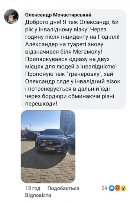 Как отметили жители в комментариях к сообщению о примирении мужчин, владелец Volkswagen продолжил нарушать правила дорожного движения. Через час после драки эту машину припарковали на двух местах для инвалидов у местного торгового центра.