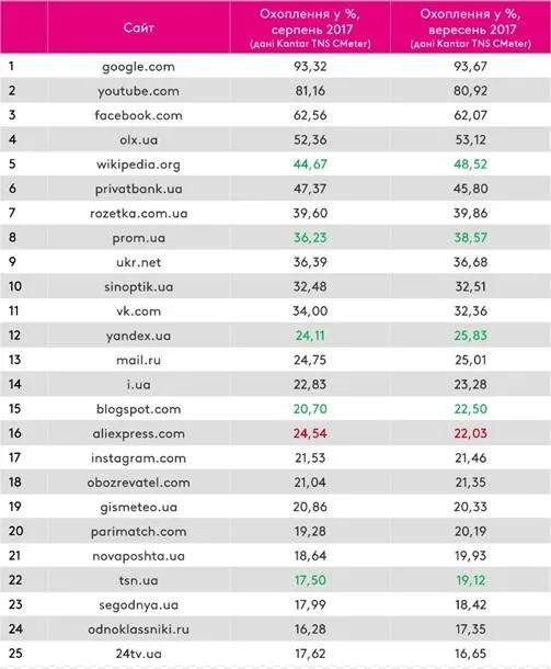 Полный сентябрьский ТОП-25 популярных сайтов выглядит следующим образом: