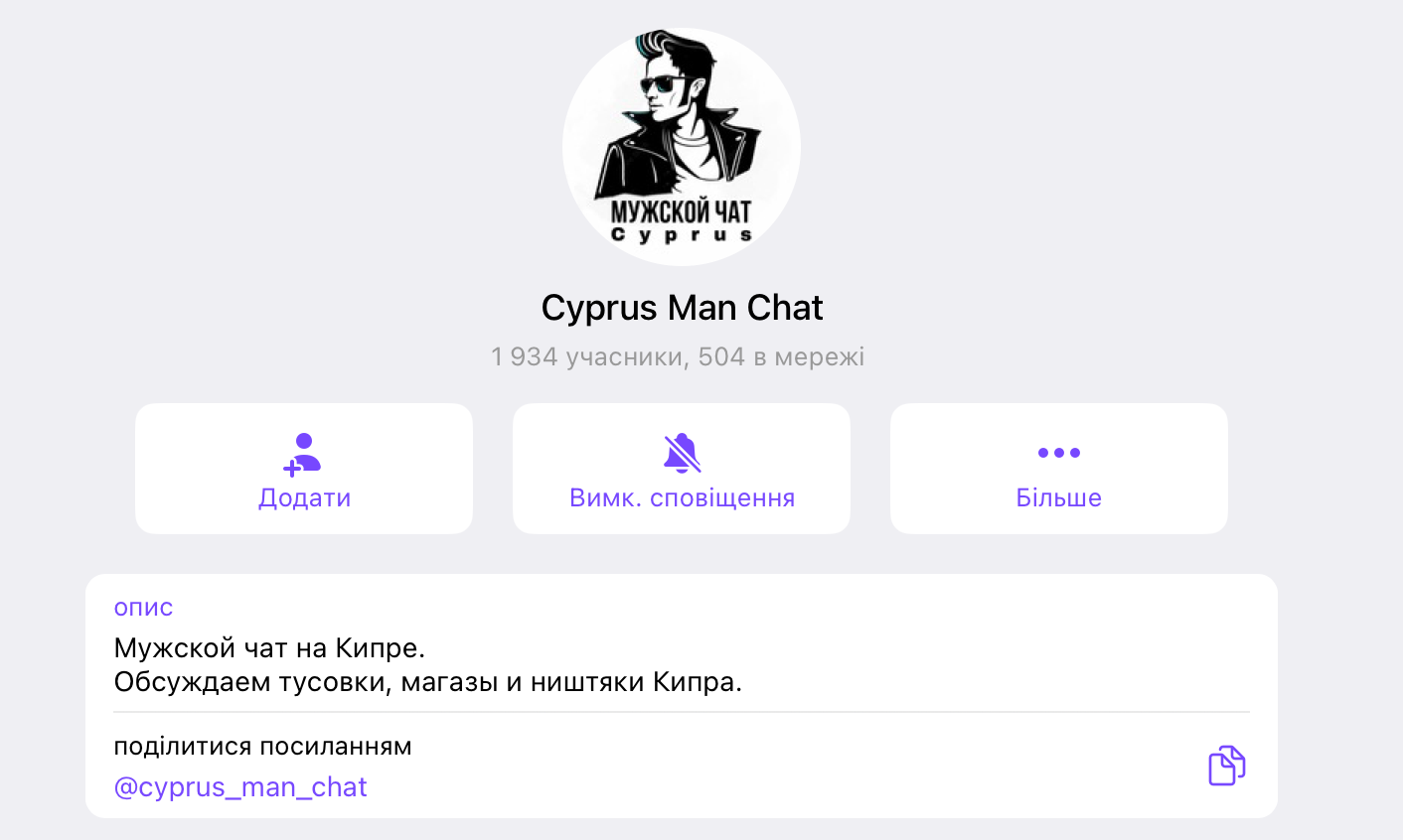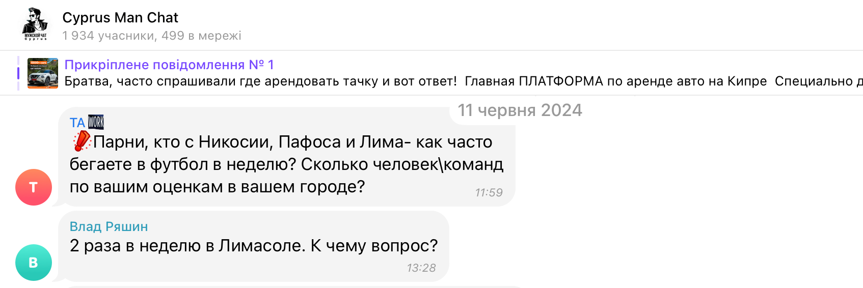 В Telegram мы нашли подтверждение: жена Ряшина Екатерина подписана на многочисленные тематические паблики, в частности "Кипр: недвижимость", "Обменник Кипр", "Госуслуги: Кипр – РФ". Кроме того, сам Ряшин однажды обмолвился о том, как проводит свободное время, в публичном чате "Cyprus Man Chat". На вопрос о посещении футбольных матчей на Кипре он ответил, что дважды в неделю ездит в Лимасол – город на юге островного государства.