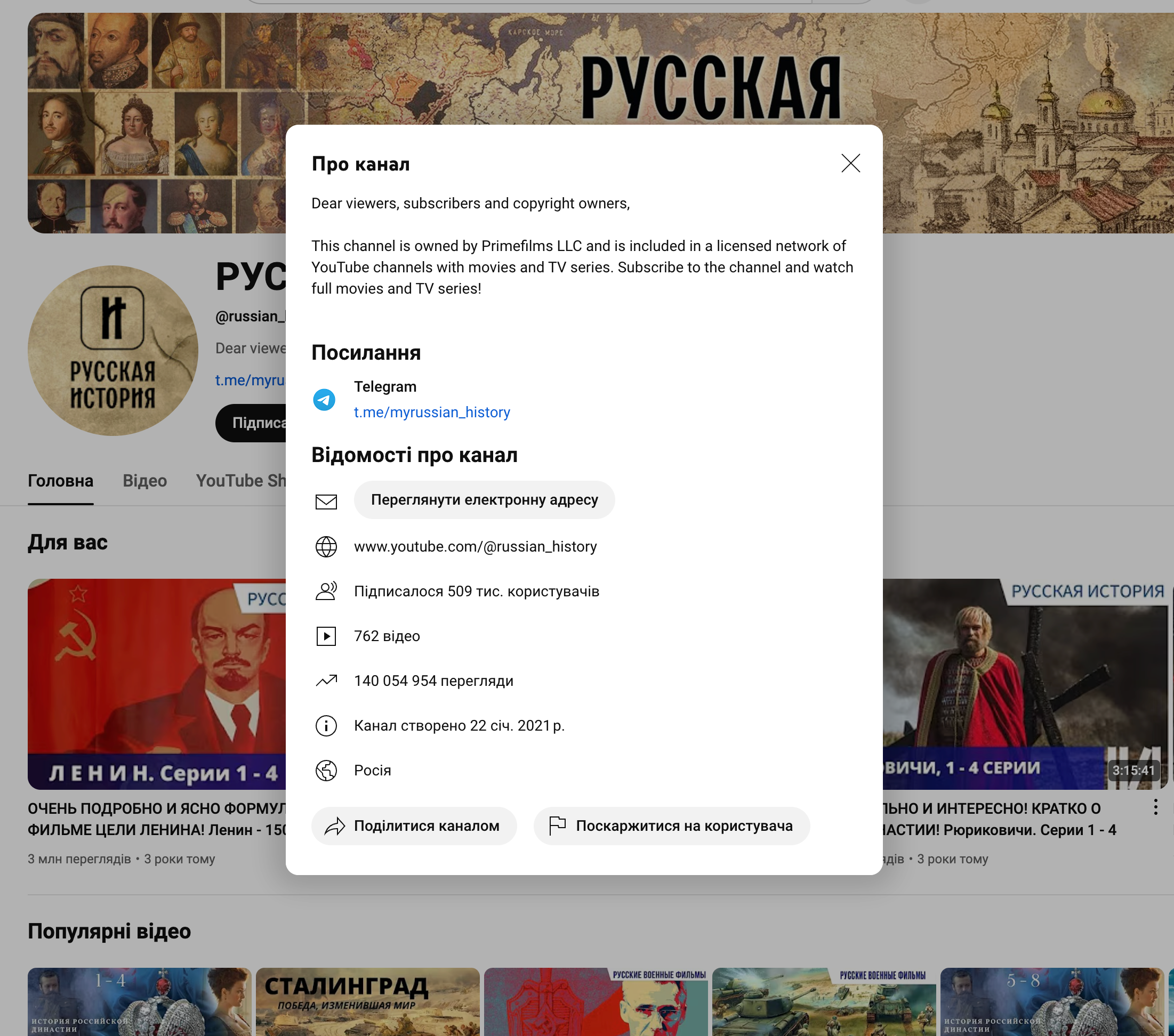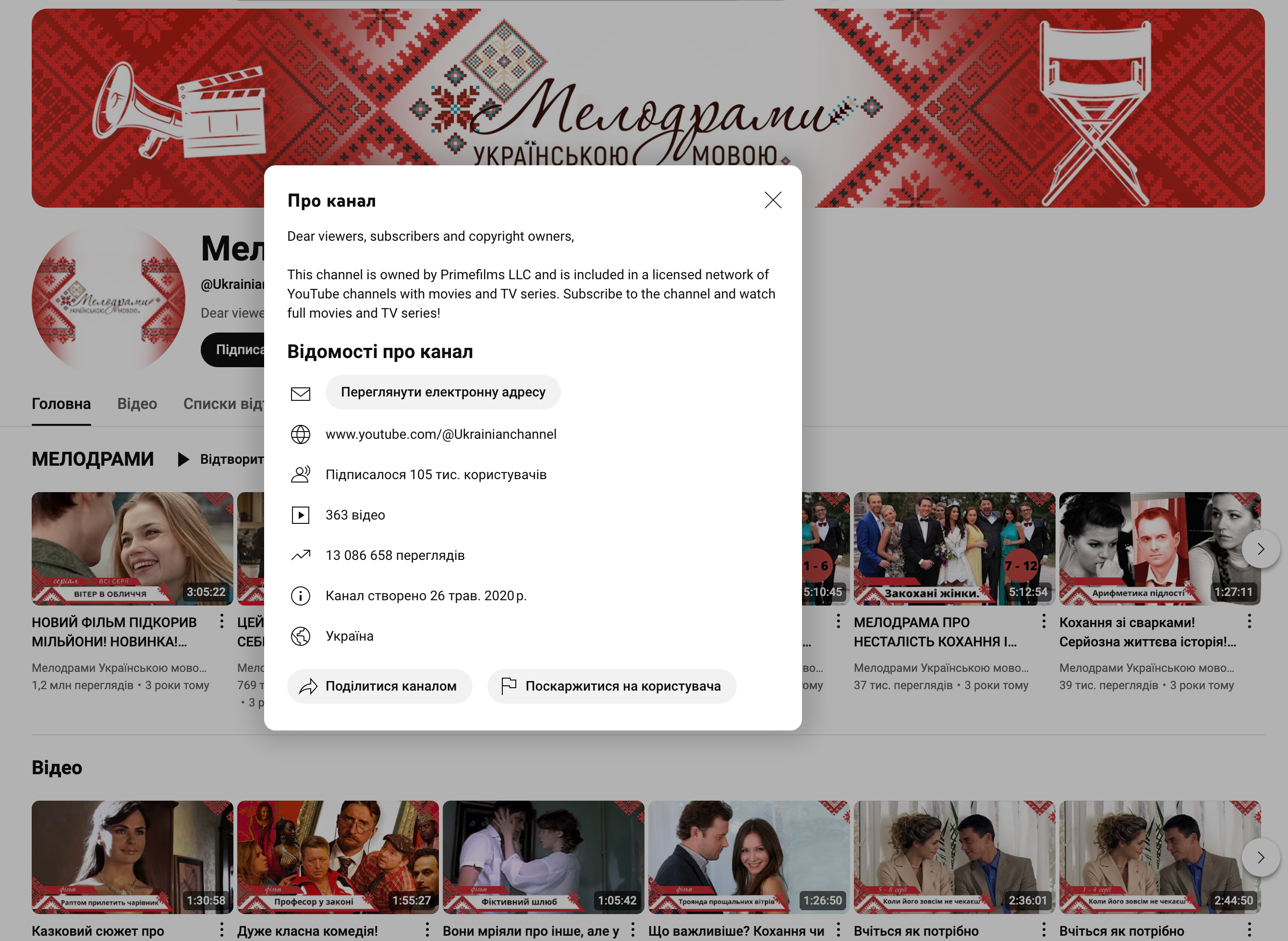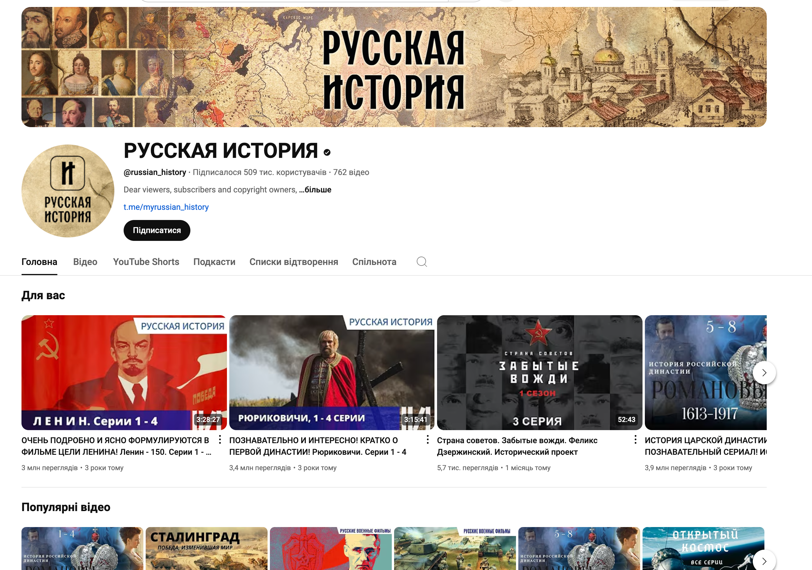 И это не было бы темой для материала, если бы речь шла только о русскоязычных каналах, ориентированных на россиян, наподобие "Русской истории". Однако среди длинного списка YouTube-каналов мы нашли "Мелодрамы на украинском языке".