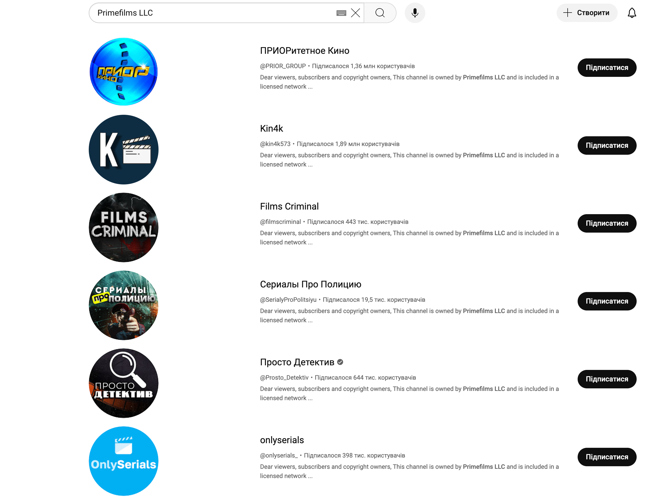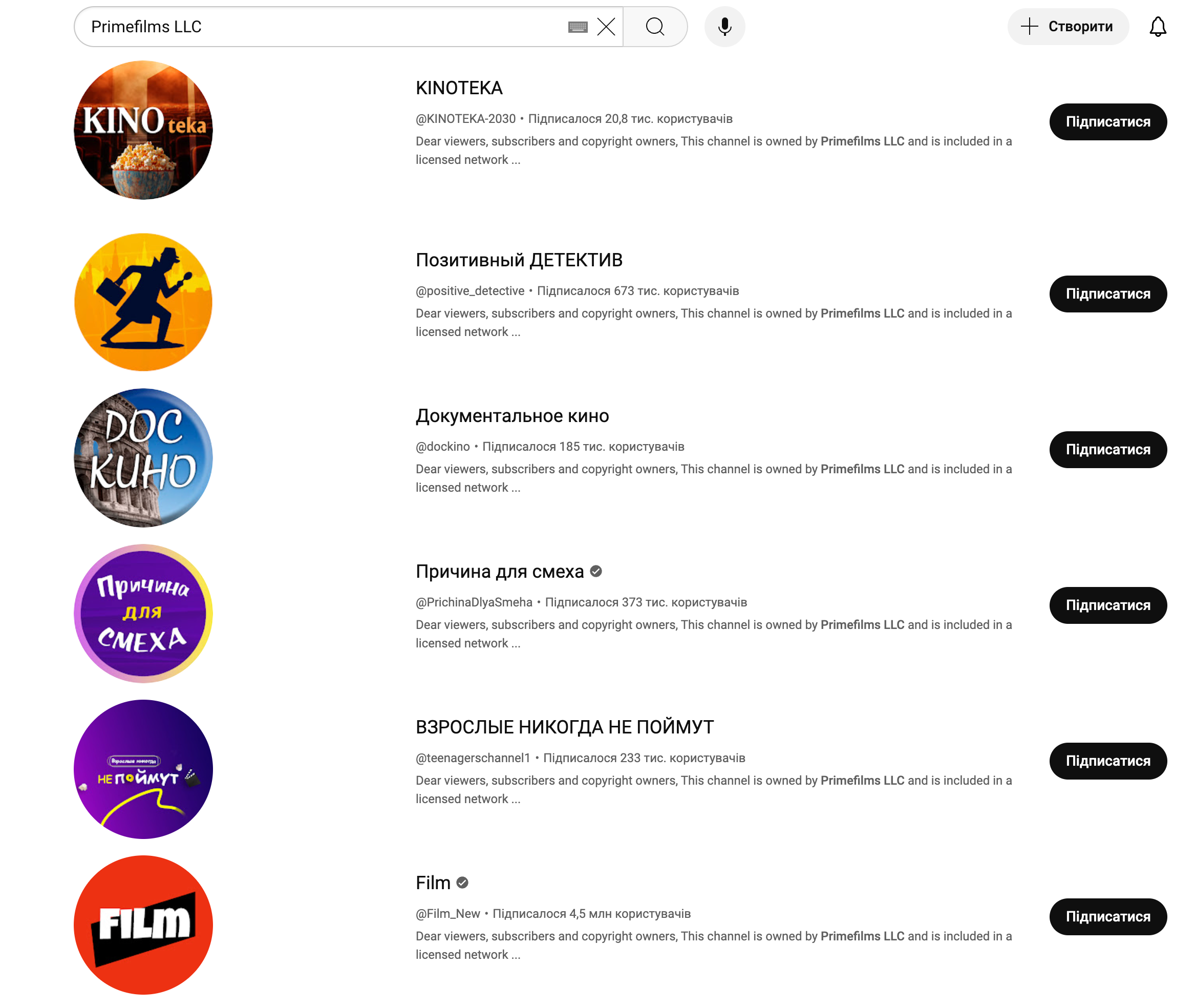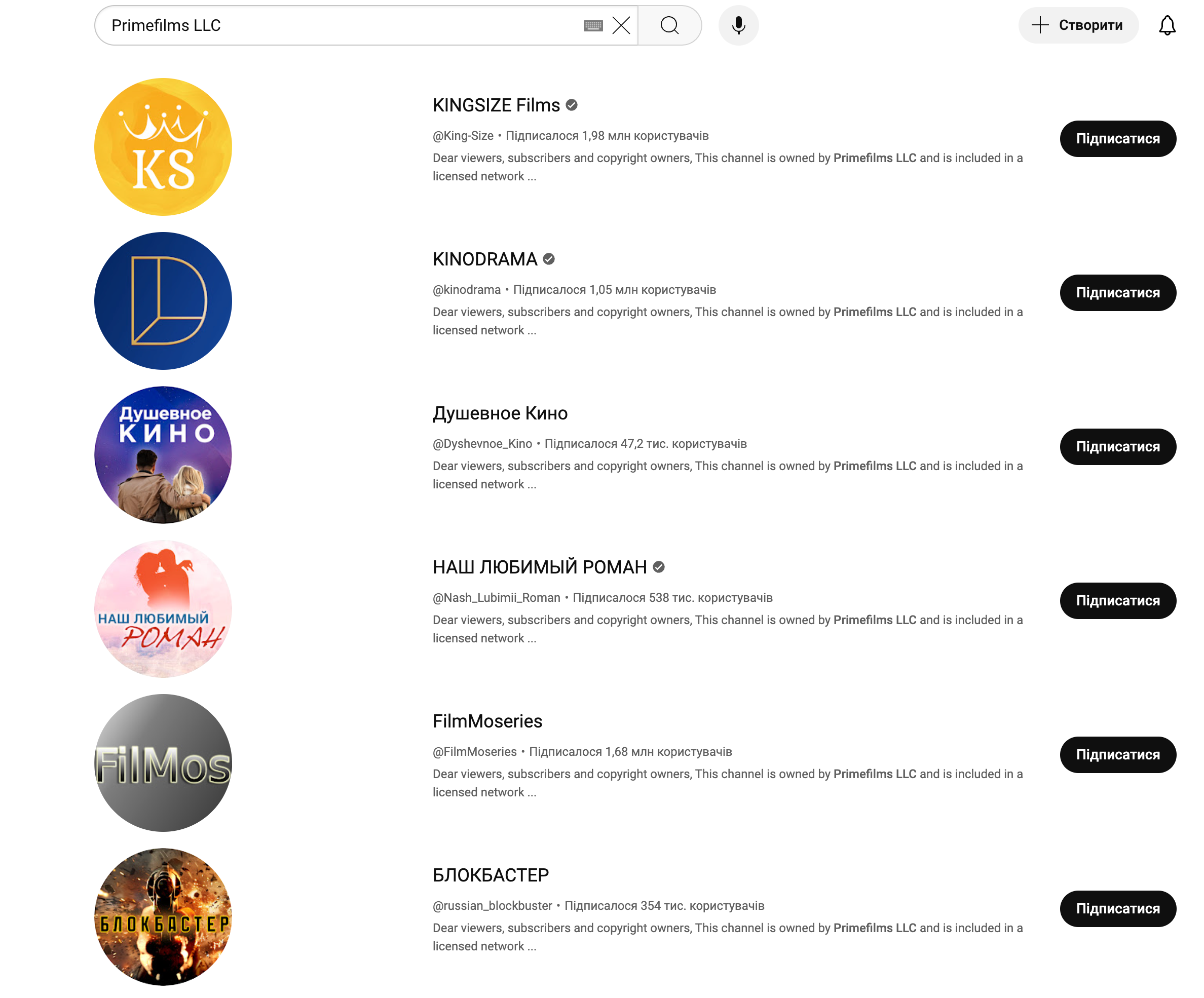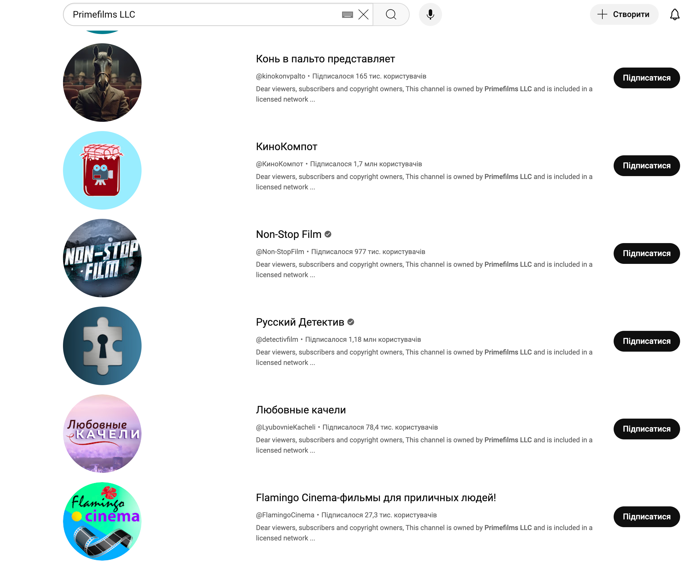 В целом это около 150 YouTube-каналов, в которых в описании можно найти такой текст с упоминанием компании Primefilms LLC: