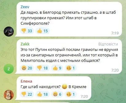 В том, что Путин посетил Херсонскую и Луганскую области, даже россияне сомневаются. Они спрашивают, вдруг не в Кремле ли размещен штаб, где диктатор произносил речь и требуют больше фото и видеодоказательств.