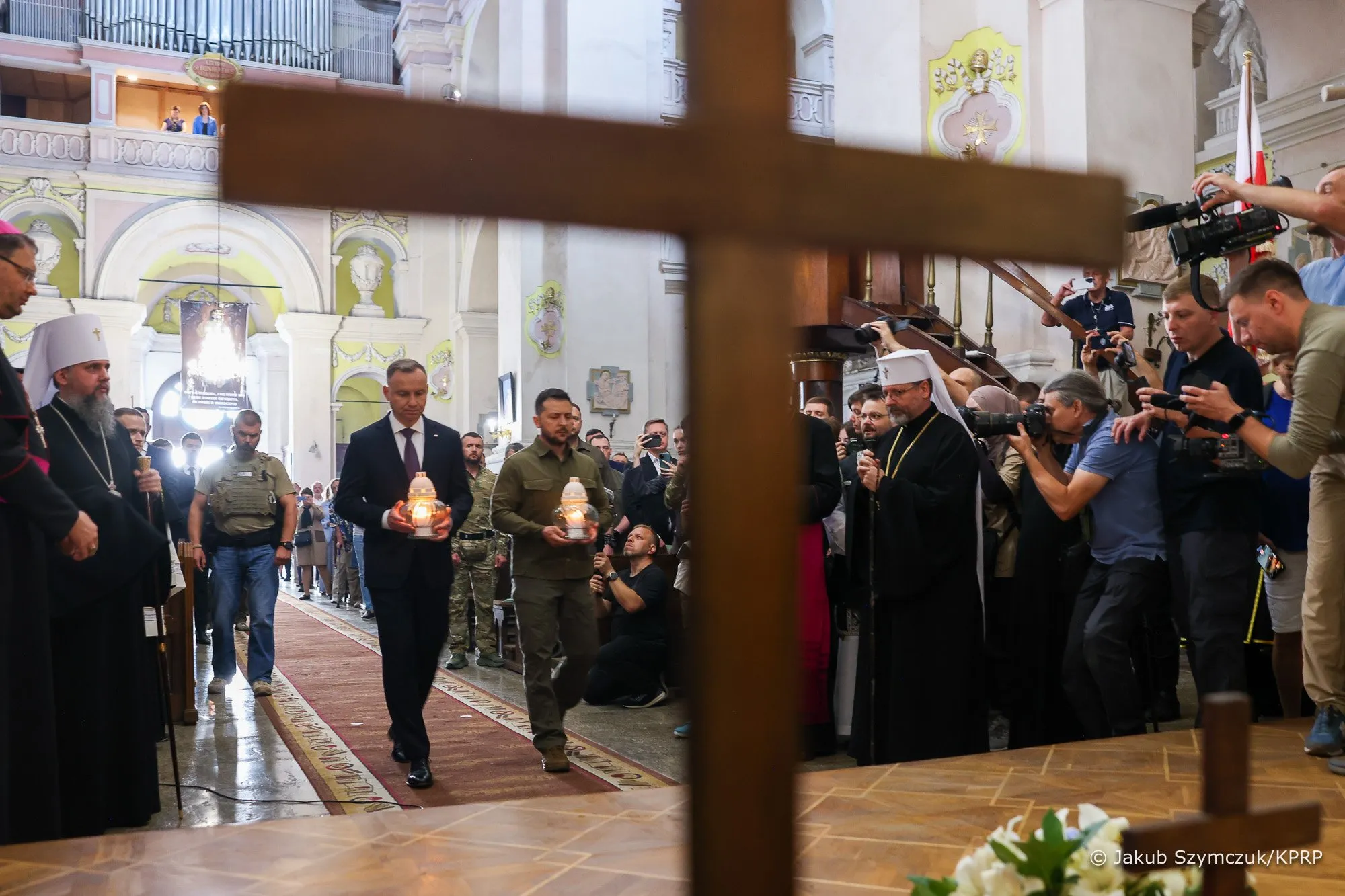 Вскоре началась траурная месса, в которой приняли участие президенты двух стран. Заметим, что на мессу также прибыли митрополит Православной церкви Украины Епифаний, митрополит Луцкий и Волынский Михаил, Блаженнейший Святослав, глава Украинской греко-католической церкви.
