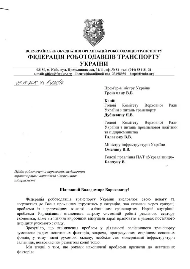 "Внутренние проблемы" Укрзализныци "представляют угрозу системной работе реального сектора экономики, ведь отечественные производители вынуждены работать в условиях постоянного дефицита подвижного состава", – говорится в письме.
