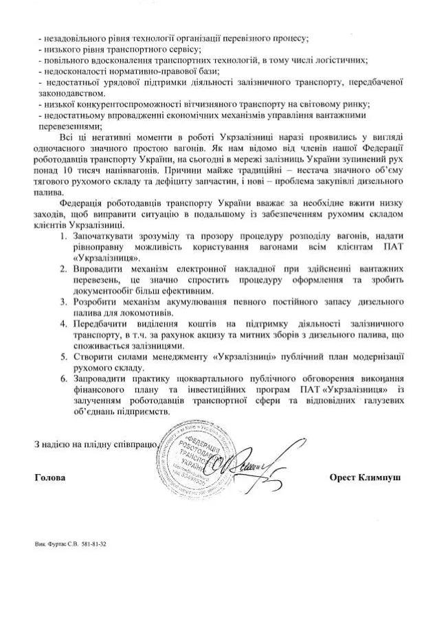 Федерация работодателей транспорта Украины считает необходимым принять ряд мер, чтобы исправить ситуацию. В частности, необходимо создать понятную и прозрачную процедуру распределения вагонов, предоставить равные возможности пользования вагонами всем грузоотправителям. Упростить процедуру оформления грузоперевозок и сделать более эффективным документооборот поможет внедрение механизма электронной накладной.