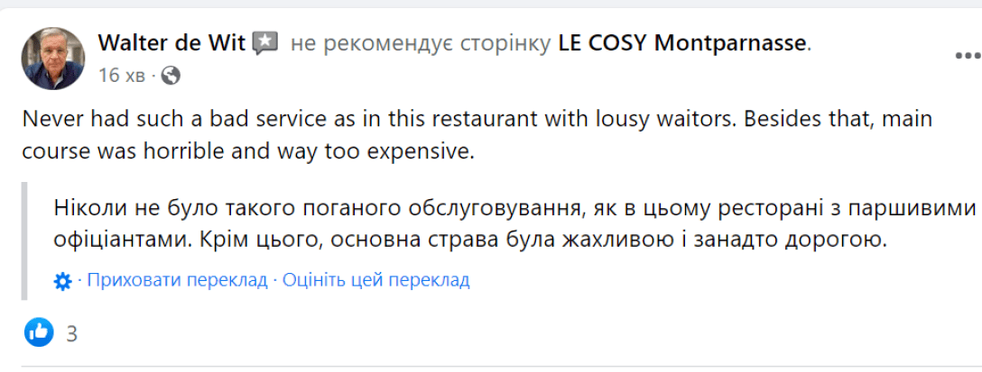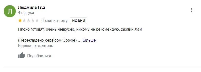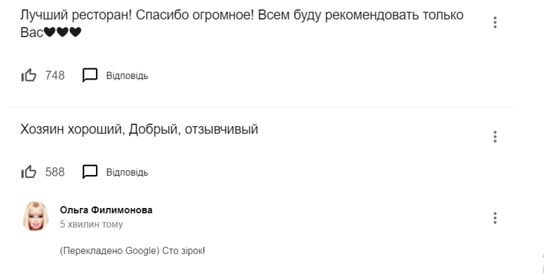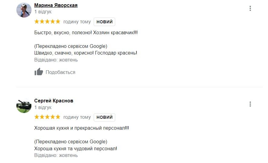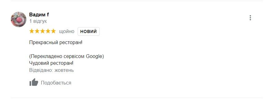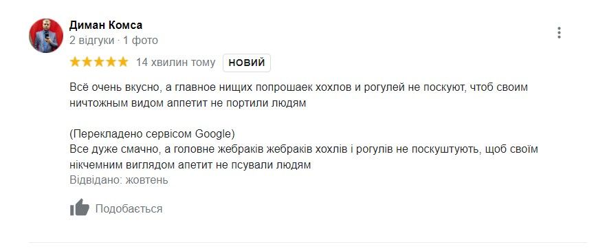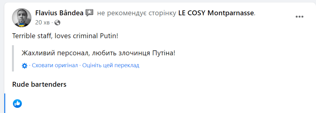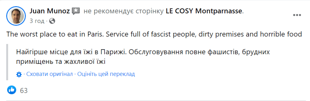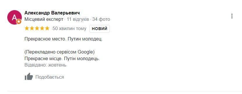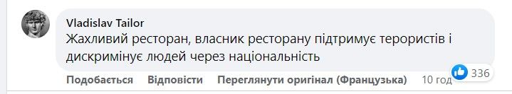 В отзывах Google и в Facebook масса единиц. В комментариях украинцы и европейцы советуют не посещать заведение, ведь "ни сервиса, ни вкуса". Также можно увидеть, как подключились россияне. Очевидно, узнав о скандале, граждане страны-агрессора решили поддержать французского путиниста, начали ставить заведению 5 звезд и ободрять такое поведение.