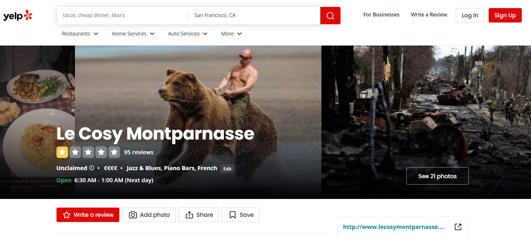 На популярном ресурсе-каталоге Yelp этот ресторан "украсили" коллажи о руководителе Кремля, также украинцы разместили там фото с последствиями зверств российской армии в Буче.