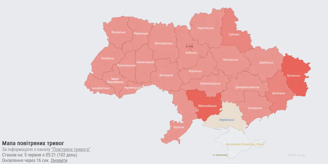 Карта воздушных тревог по состоянию на 5:21 / Скриншот alerts.in.ua