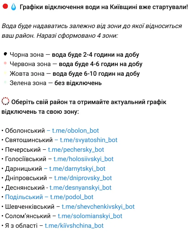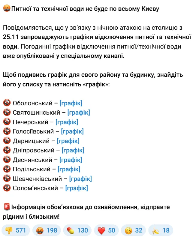 Несколько телеграм-каналов распространяли информацию, якобы в столице после атаки впервые ввели графики отключения воды. Мол, 25 ноября воду будут подавать почасово, а чтобы узнать детали, следует подписаться на какой-то телеграм-канал по приведенной ссылке.