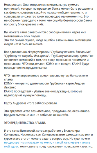 9 декабря пророссийский коллаборационист, который взорвал управление СБУ в Одессе, Владимир Грубник опубликовал пост-ответ, отстаивая честь блогеров-военкоров и обвиняя команду ведущего путинского телевизионного пропагандиста Соловьева в систематической лжи.