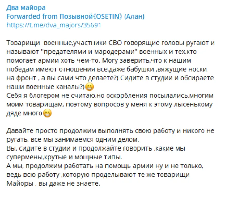 Но даже несмотря на это, кремлевские пропагандисты продолжают атаковать российских военных блогеров. 3 марта Борис Яковенко, ведущий военно-пропагандистского шоу "Утро Z" на "Соловьев Live", выступил с сокрушительной критикой телеграм-канала "Два майора", назвав их "двумя мародерами".
